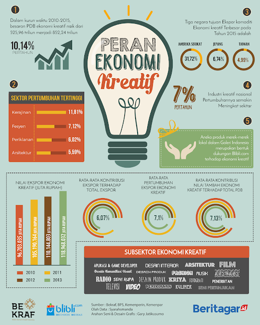 DI indonesia hingga tahun 2016, total pendapatan dari industri ekonomi kreatif mencapai Rp 642 Trillun, namun dari sekain banyak industri kreatif hanya ada 3 industri kreatif yang memberikan kontribusi paling besar untuk pendapatan ini. Industri yang paling berperan tersebut yaitu kuliner, fashion, dan kerajinan. Bayangkan bagaimana jika pemerintah bisa menggerakkan semua potensi dari berbagai sektor industri kreatif lainnya maka hal ini akan mendorong pertumbuhan ekonomi yang lebih cepat lagi.