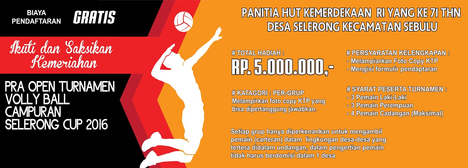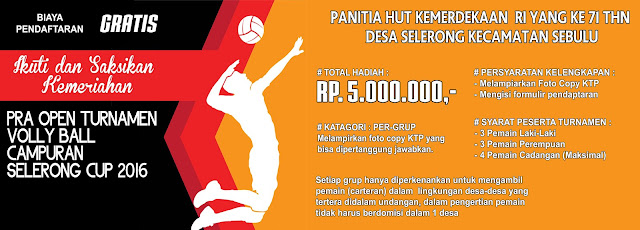 Spanduk Pengumuman Lomba Volly Ball Campuran Ditulis oleh Admin KAKCIS Pada May 10, 2020 Post a Comment Nama :Ukuran :Keteranga :